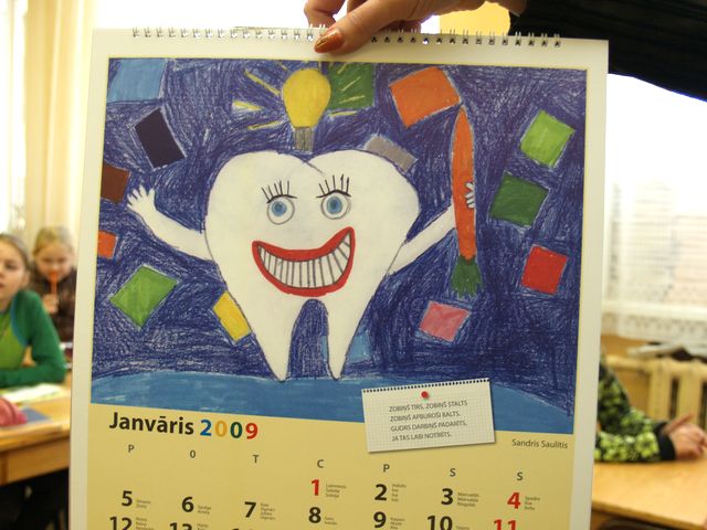 Par interesantāko zīmējumu un četrrindi, kas iekļauta Mutes veselības kalendārā, tika sumināts Tukuma 2. vidusskolas 4.b klases skolēns Sandris Saulītis. Tieši viņa zīmējums rotā kalendāra pašu pirmo – janvāra – lappusi.