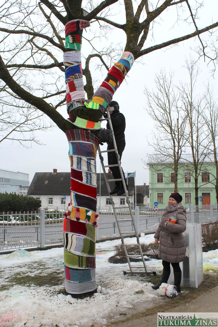 Nu krāšņais darbs tika izlikts publiskai apskatei. Bet arī šis darbiņš nebija viegls – lai garo šalli aptītu ap koku, nācies saukt palīgā arī Krišjāņa tēti Kristapu Vinslavu, kurš, būdams ugunsdzēsējs, profesionāli visu nokārtojis. Nu darbu varēs skatīt līdz pat laikam, kad kokam lapiņas sākšot plaukt, bet uz ziemu koks atkal tikšot ietīts siltā šallē.