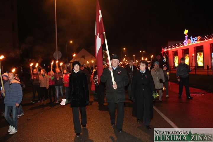 Lāčplēša dienas Lāpu gājienā pie Tukuma novada domes 11. novembrī pirms 18.00 teju tūkstotis ļaužu pulcējās. Pārsvarā jaunieši. Ik ielā – Pasta, Meža un Kurzemes, pa kuru lāpneši gāja, tiem pievienojās lieli un mazi, jauni un veci – visi, kas varoņu piemiņu godā. Ļaudis līdz Kārļa Zemdegas piemineklim Puisītis Meža kapos gāja. Lāčplēša dienā, latviešu tautas uzvaras svētkos klātesošos sveica novada domes priekšsēdētājs Juris Šulcs, jaunsardze Elīna Pļaviņa, vēl daudzi skaļi un savās sirdīs pie sevis. Pasākumu vadīja Liene Venterzute, muzikālo skanējumu šoreiz sarūpēja Tukuma Vakara un neklātienes skolas skolēni un skolotāji.