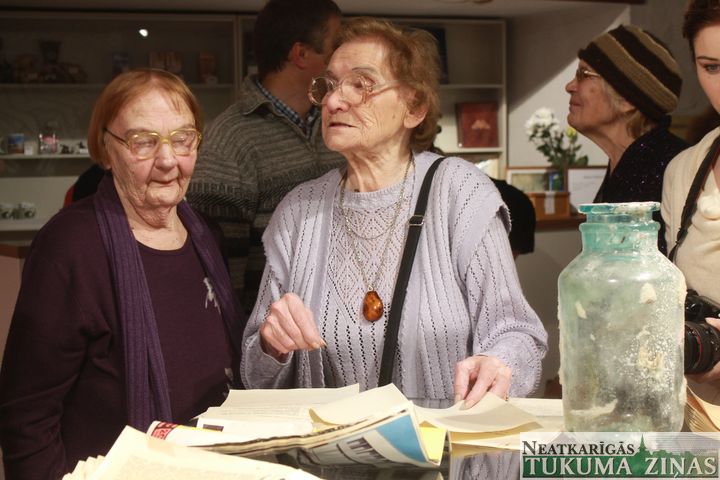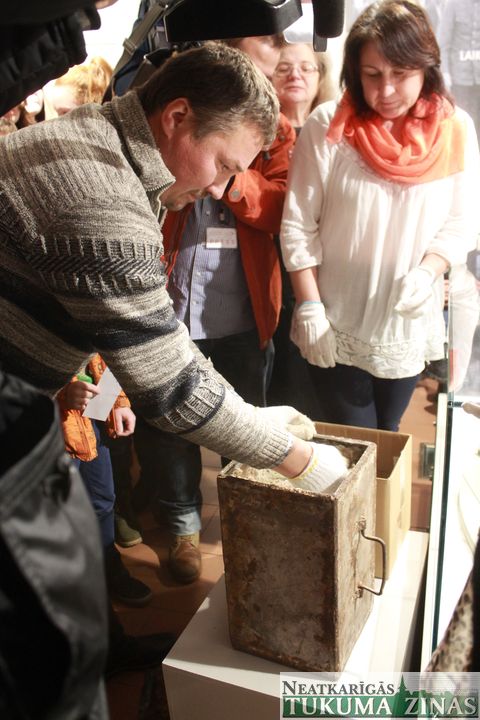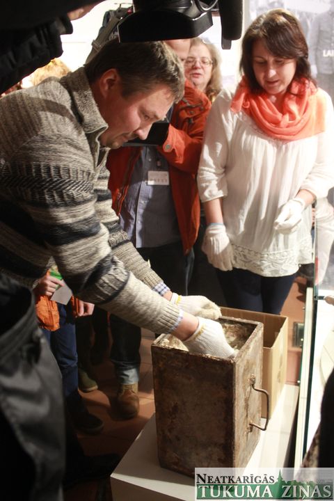 Atverot vienu aizmetinātās kastes daļu, varēja ieraudzīt stikla burku ar stikla korķi. Burka no visām pusēm bija aplikta ar stikla vati, bet pati burka aiztaisīta ar vasku. Burkā saritinātā veidā bija ielikti 1967. gadā izdoti preses izdevumi – žurnāla «Zvaigzne» 1967. gada 20. oktobra numurs, laikraksta «Komunisma Rīts» 20 dažādu mēnešu numuri, divi laikraksta «Cīņa» numuri, izdevums «Saimnieciski-finansiālie rādītāji Tukuma rajona kolhozos un padomju saimniecībās par 1966. gadu», kā arī vēstījums paaudzēm, kas svinēs Lielās oktobra sociālistiskās revolūcijas 100. gadadienu. No kapsulas izņemtie dokumenti šobrīd ir apskatāmi Pils tornī.