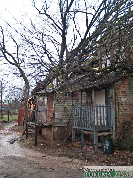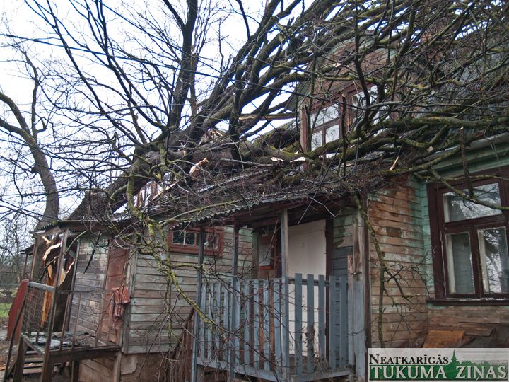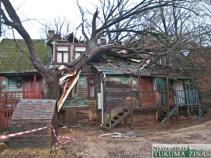 Sestdien, 13. decembrī, Tukumā, Rīgas ielā 7, ap 5.00 no rīta uz dzīvojamās mājas uzkritis vēja nolauzts koks, sabojājot jumtu un dūmvadu. No ēkas evakuēti 10 cilvēki, kas izmitināti patversmē. Tikai laimīgas sagadīšanās dēļ neviens no cilvēkiem, kas dzīvoja jumta izbūves dzīvoklīšos, nav cietis.