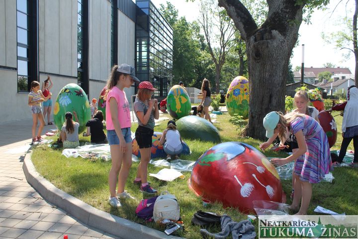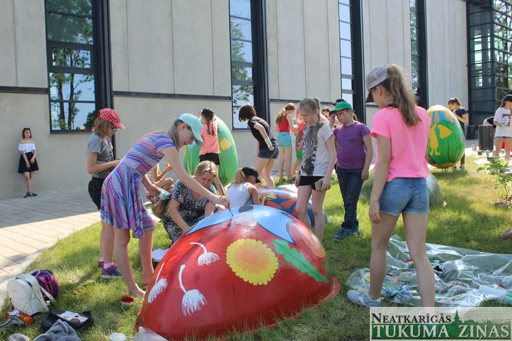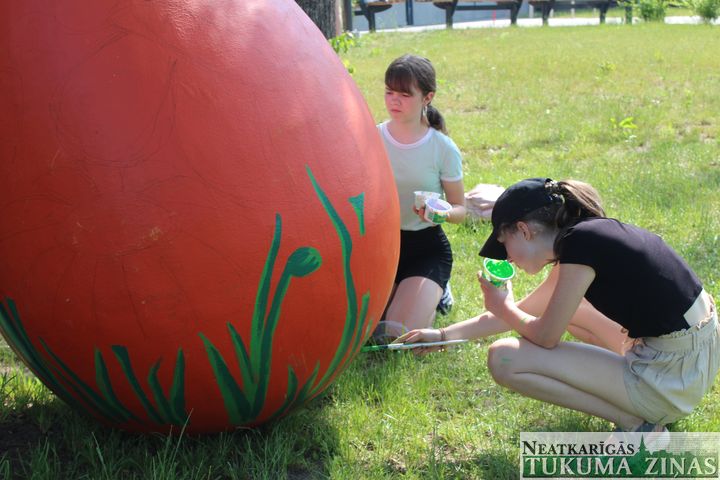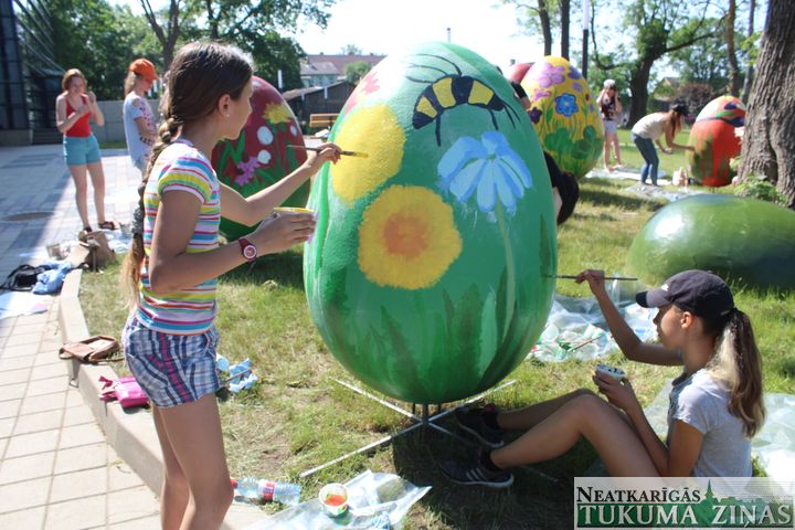 Vasaras plenērs, kā pastāstīja skolotājas Gunta Čivle un Velga Melne, ir neatņemama mācību procesa sastāvdaļa, tikai parasti tiekot zīmēts pilsētas ielās un laukumos, ko šogad dara jaunākie skolas audzēkņi: “Šis uzdevums ar olu apgleznošanu nāca no domes, un to uzticējām vecāko kursu audzēkņiem, kam šī ir laba pieredze mācīties veidot vides objektus, kā arī strādāt lielos laukumos. Pirms tam bērni ļoti rūpīgi sagatavoja skices, bet tagad var sevi pārbaudīt komandas darbā. Katram ir jāiztēlojas, kāda viņa komandas apgleznotā ola būs, jo uz to taču viss Tukums skatīsies! Tāpēc jāvērtē, kā krāsas sedzas un lai nav švīku. Turklāt tas ir darbs zem klajas debess, kad jārēķinās, ka otas kalst un krāsas žūst…”