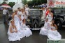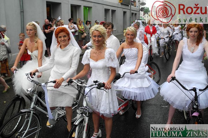 Lietus nespēja aizbiedēt kāziniekus, drīzāk deva nelielu atelpu pēc sutīgās priekšpusdienas. Kāzu kleitas un līgavas uz velosipēdiem. Retro automašīnas un floristu darbi visā pilsētā. Un, protams, lielais rožu vainags, kāzu tosti un uzrunas. Valsis, mičošana un dejas – dažam, arī līdz rītam.