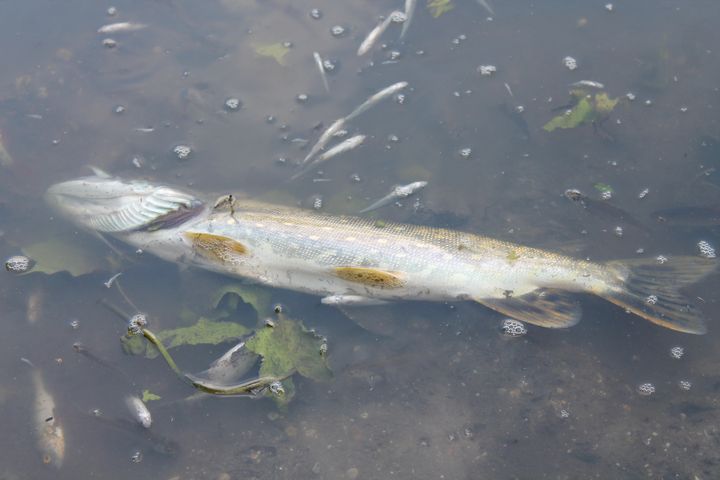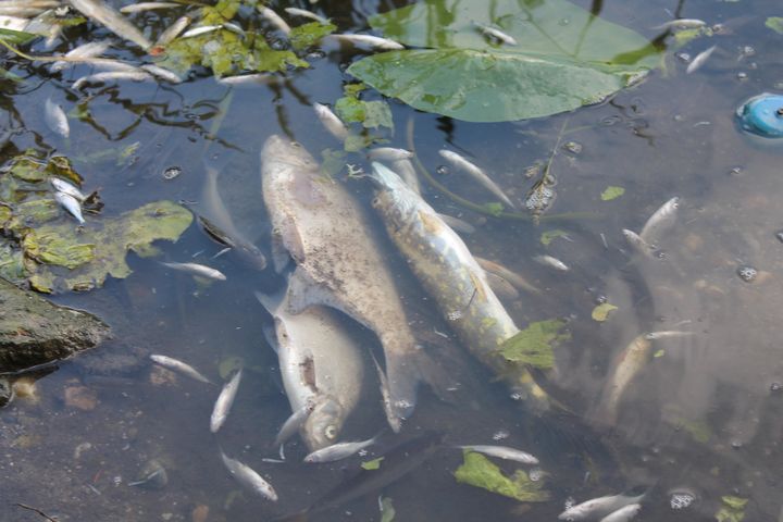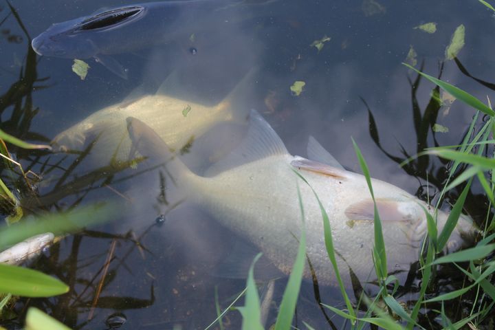 Līdakas, brekši, līņi, raudas, karpas – liels daudzums lielo zivju un simtiem maziņo redzamas pie krasta, taču, kā stāsta makšķernieks, rīta agrumā zivju bijis vēl vairāk, taču daļa jau nogrimusi un vēl lielu daudzumu apēdušas kaijas.