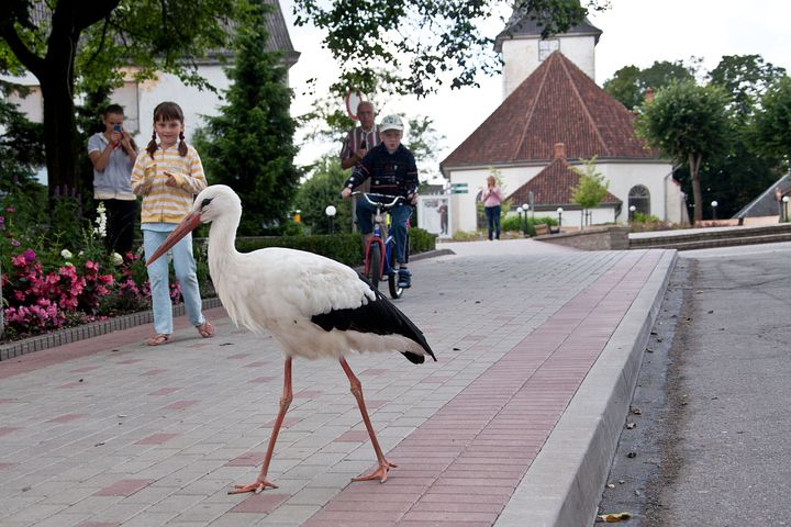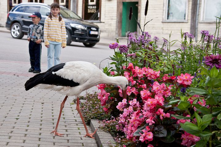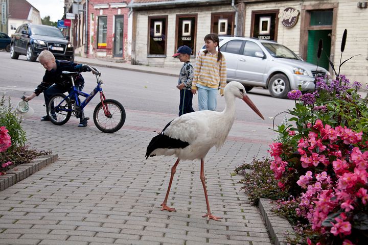 arī Laucienē vienā mierā pastaigājas stārķis pa pagalmiem. Neesmu redzējusi, ka kāds viņam pievērstu īpašu uzmanību. Dzīvo uz mājas jumta skursteņa. Garām ejot jāskatās, ka neuzmet kādu pļeku uz galvas. Citādi tāds pats īrnieks kā mēs. Garās kājas planē gar logiem. Tas ir pagājušā gada bērns un tepat izaudzis un pieradis pie mums, bet mēs pie viņa.