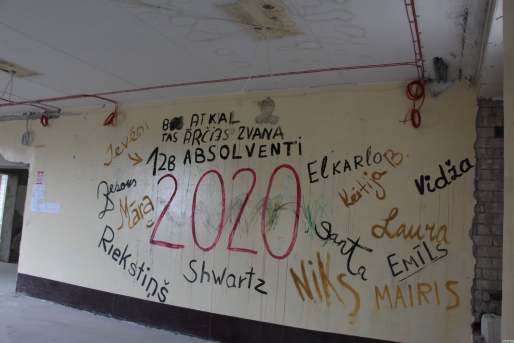 Kā pārliecinājāmies, izstaigājot visu skolas ēku no pagraba līdz trešajam stāvam, šobrīd būvnieku “pieskāriens” redzams pilnīgi visās telpās, atklājot, piemēram,   dažādus sienu krāsu slāņus, kas ”uzkrājušies” 50 gadu laikā. Tiesa, tā kā sienu segums vēl nav atjaunots, vietām uz tām redzamas arī audzēkņu atstātās “pēdas” – zīmējumi un sveicieni skolai un skolotājiem ar audzēkņu vārdiem un uzvārdiem, kas jau pavisam drīz pazudīs zem jaunas sienu apdares un krāsojuma. Vēl pamanām, ka kabinetos un gaiteņos jūtams lielāks plašums, ko rada tas, ka viss, kas demontējams un lieks, esot noārdīts. Kā izrādās, daudzajos pastāvēšanas gados veikto nelielo remontu laikā skolas ēka tikusi visai pamatīgi pārbūvēta – šis tas izņemts, šis tas piebūvēts, bet šī brīža rekonstrukcijā, kā skaidroja T. Pavilēns, lielākoties plānots atgriezties pie ēkas sākotnējā arhitektoniskā risinājuma, izjaucot, piemēram, mazos kabūzīšus, paplašinot tualetes vai, piemēram, blakus aktu zālei, gluži kā senāk, ierīkojot mūzikas klasi ar labu skaņas izolāciju. Aktu zālē plānots atjaunot skatuvi, kas reiz tikusi nojaukta, lai zālē būtu vairāk vietas. Šobrīd zāles vidū zem pārklāja salikts arī vecais parkets, kuru plānots izmantot atkal, jo tas esot salīdzinoši labā stāvoklī, turklāt – ar ausīm tīkamu skaņu, kas rodoties staigājot.
