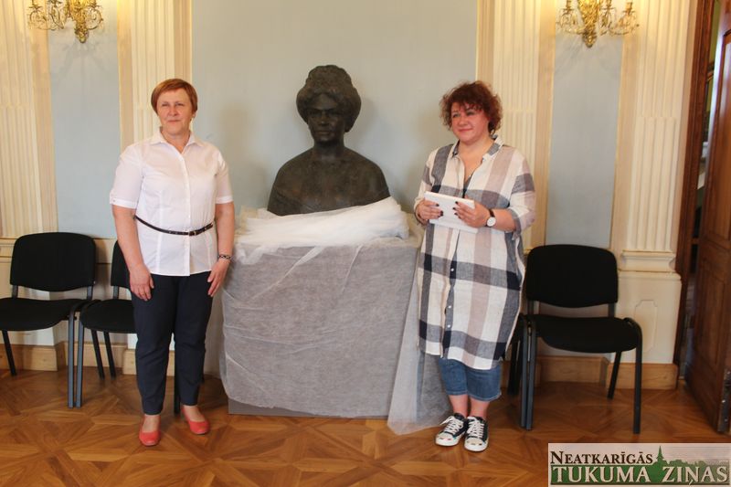 Kā stāstīja muzeja direktore Agrita Ozola, tieši pirms 90. gadiem – 1929. gadā – Aspazija piecas nedēļas dzīvojusi Durbes pilī, un telpā, kur tagad iekārtota bibliotēka, bijusi dzejnieces istaba: “Viņa te jutās laimīga; viņai patika tukumnieki, brīnišķīgais skats pa logu un te viņa sarakstīja vairākus dzejoļus. Savukārt šo krūšutēlu 1931. gadā ir darinājis slavenākais latviešu skulptors Teodors Zaļkalns – viņš Itālijā bija studējis bronzas liešanas tehnoloģijas, un arī šis bronzas darbs izliets Itālijā. To viņš īpaši darināja Latvijas Nacionālajam teātrim, bet tā sagadījās, ka šajā teātrī tam neatradās vieta, tāpēc daudz gadus tā atradās Latvijas Nacionālajā mākslas muzejā, bet pēc kāda laika teātris to sagribēja atpakaļ. Teātrī tā sabija līdz pat tā rekonstrukcijai 2002. gadā, bet tās laikā tā tika pazaudēta. Tāpēc esam pateicīgi Raimondai un Armandam, ka viņi, ieraugot šo brīnišķīgo mākslas darbu, izlēma, ka tam jābūt muzejā.” A. Ozola stāstīja, ka visdrīzāk ēkas rekonstrukcijas laikā mākslas darbs nebija laikus nogādāts citā vietā un tā arī tika pazaudēts. Sazinoties ar teātri, esam noskaidrojuši, ka viņiem nav pretenziju, ka mākslas darbs ir Tukuma muzeja īpašums, savukārt mums nav pretenziju, ka darbs kādu brīdi tiek izstādīts teātrī, taču tā arvien būs muzeja īpašums. Jāpiebilst, ka šīs ir pirmais tik apjomīgais Teodora Zaļkalna mākslas darbs Tukuma muzeja kolekcijā.”