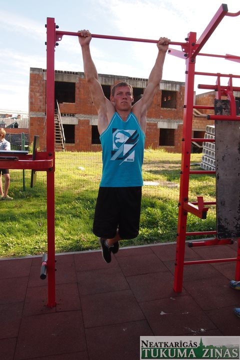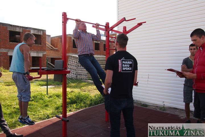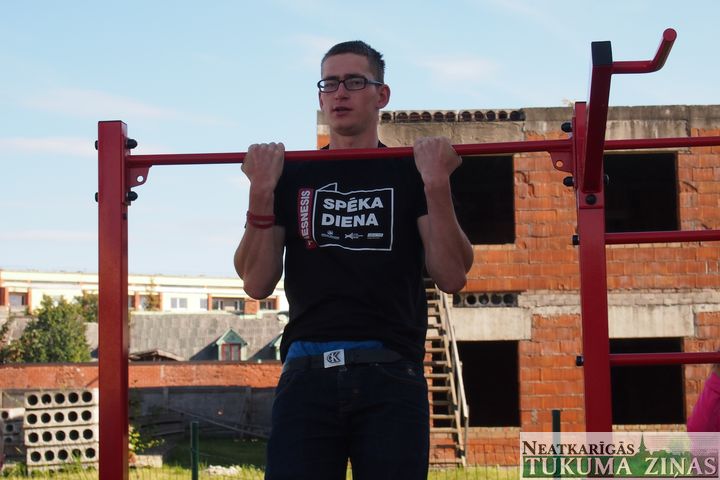 Visas dienas garumā pie Tukuma Ledus halles cilvēki pārbaudīja savus spēkus, pievelkoties pie stieņa. Pievilkšanās reizes skaitīja, visu pierakstīja un uzraudzīja Tukuma ielu vingrotāji Andrejs Smirnovs, Jānis Indrāns un Artūrs Anmanis. Tiesneši ne tikai pamācīja, kā pareizi jāpievelkas, bet arī uzmundrināja un iedrošināja cilvēkus piedalīties, jo katra pievilkšanās reize bija no svara. “Ir divi pievilkšanās veidi – meitenēm un zēniem. Zēniem ir ar taisnām rokām virstvērienā jāpievelkas virs pievilkšanās stieņa tā, lai zods ir pāri stienim, savukārt meitenēm jāpievelkas apakštvērienā un rokām jābūt ieliektām 90 grādu leņķī,” pastāstīja A. Smirnovs. Noteiktos laikos tiesneši par rezultātiem ziņoja centrālajam infocentram Rīgā, kas visus rezultātus apkopoja un publicēja Spēka dienas mājas lapā. Spēka diena Latvijā norisinās jau ceturto reizi un to rīko Ielu vingrotāju sporta biedrības sadarbībā ar VAS «Latvijas dzelzceļš». Šogad izdevies uzstādīt jaunu rekordu – 9 692 cilvēku visā Latvijā pievilkās 96 030 reizes.