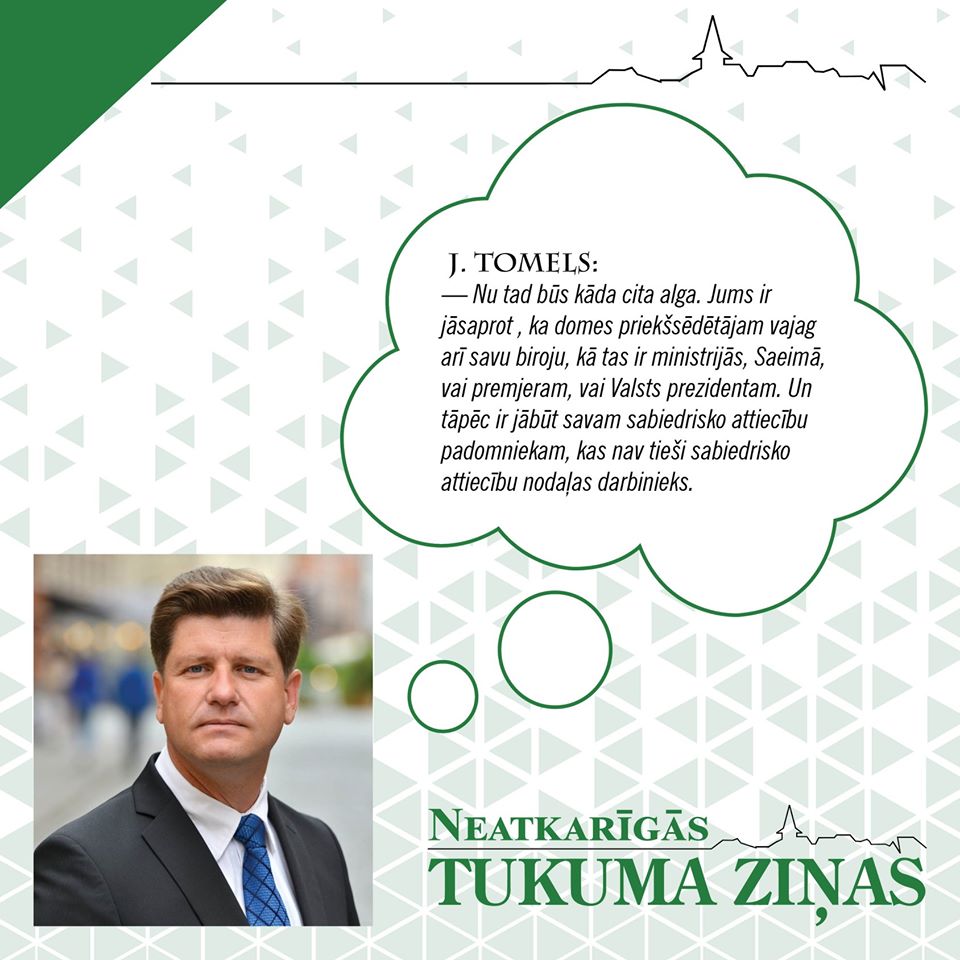 – Ir tā, ka amats Jānim Tomelam nav padomnieka amats, tas ir sabiedrisko attiecību speciālista amats. Nezinu, kur lasījāt, ka domes priekšsēdētājam nav tiesību slēgt līgumus… Domes priekšsēdētājam ir tiesības slēgt jebkādus līgumus, arī tai skaitā ar darbiniekiem.
