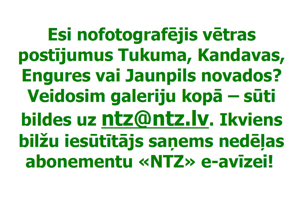 Esi nofotografējis vētras postījumus Tukuma, Kandavas, Engures vai Jaunpils novados? Veidosim galeriju kopā – sūti bildes uz ntz@ntz.lv. Ikviens bilžu iesūtītājs saņems nedēļas abonementu e-avīzei!