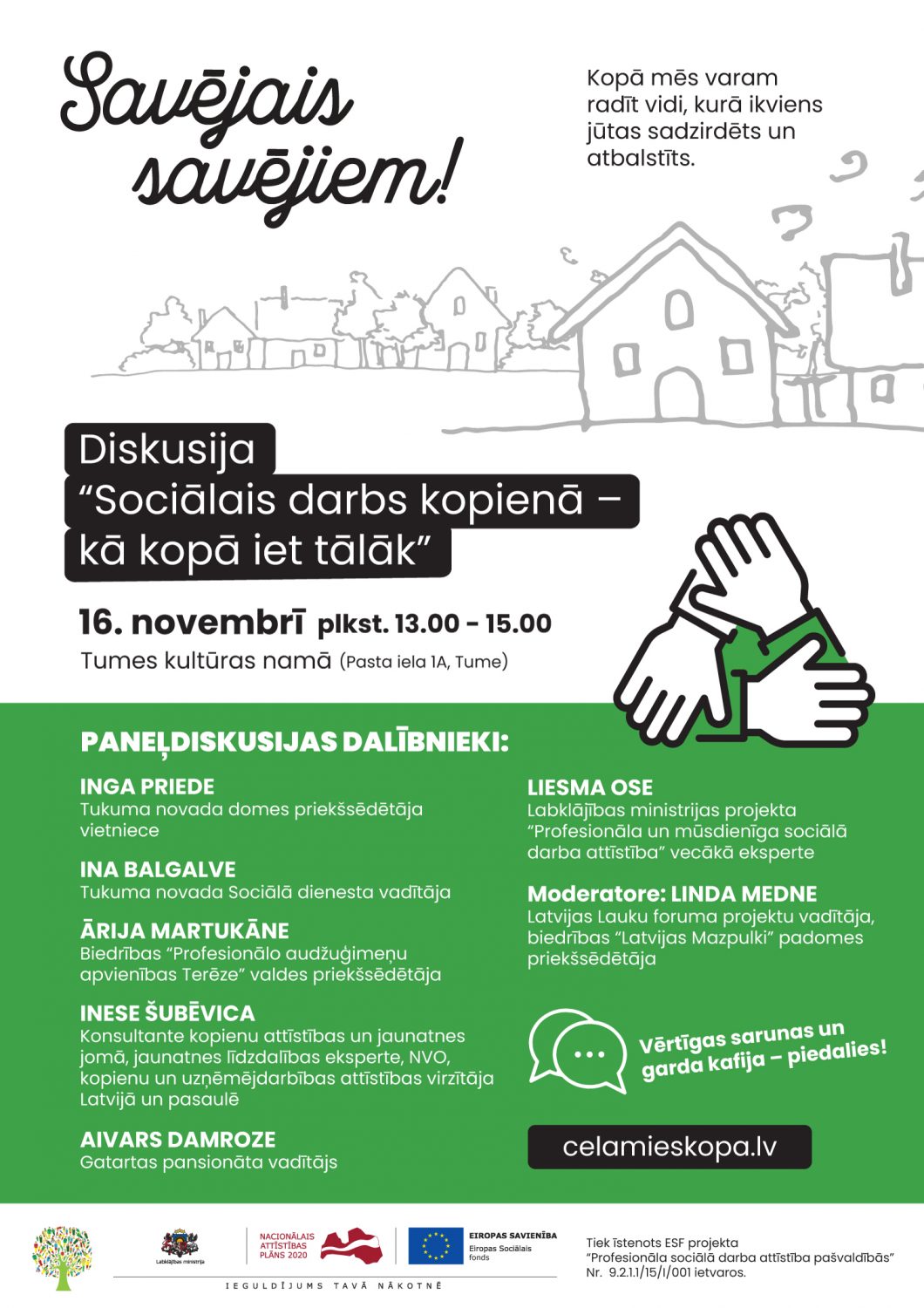 Diskusija “Sociālais darbs kopienā – kā kopā iet tālāk” notiek Labklājības ministrijas (LM) organizētās kampaņas “Savējais savējiem!” ietvaros, kas šī gada rudenī notiek visā Latvijā. Kampaņa tiek rīkota, noslēdzoties LM īstenotajam pilotprojektam “Sociālais darbs kopienā”, kura mērķis ir sociālo problēmu risināšana un to preventīva novēršana kopienas līmenī, aizsniedzot neaizsargātākās iedzīvotāju grupas, aktivizējot kopienu iekšējos resursus un veicinot sadarbību starp iedzīvotājiem un pašvaldības vadību. Atšķirībā no sociālā darbinieka, kura uzdevumi ir saistīti ar individuālu atbalstu grūtībās nonākušiem cilvēkiem, sociālais darbinieks kopienā fokusējas uz sociālo problēmu prevenci, aktīvi iesaistoties visas kopienas dzīvē. Neskatoties uz būtiskajiem ieguvumiem iedzīvotājiem, šobrīd Latvijā sociālais darbinieks kopienā kā amata vieta ir tikai nelielā skaitā pašvaldību.