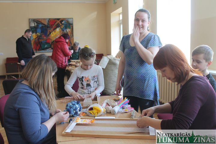 Satikt savu meistaru svētdien, 8. aprīlī, Tumes kultūras namā bija nākuši tie, kas vēlējās, piemēram, iemācīties izšūt krustdūrienā, ko ierādīja tumeniece Maruta Čauva, kuras darbu klāstā ne tikai izšūti, bet arī tamborēti rokdarbi. Kintija Kāle-Pūkaine ir aušanas lietpratēja un šoreiz maziem un lieliem rādīja, kā ar pavisam nelielām stellītēm, pagatavot pūcīti.
