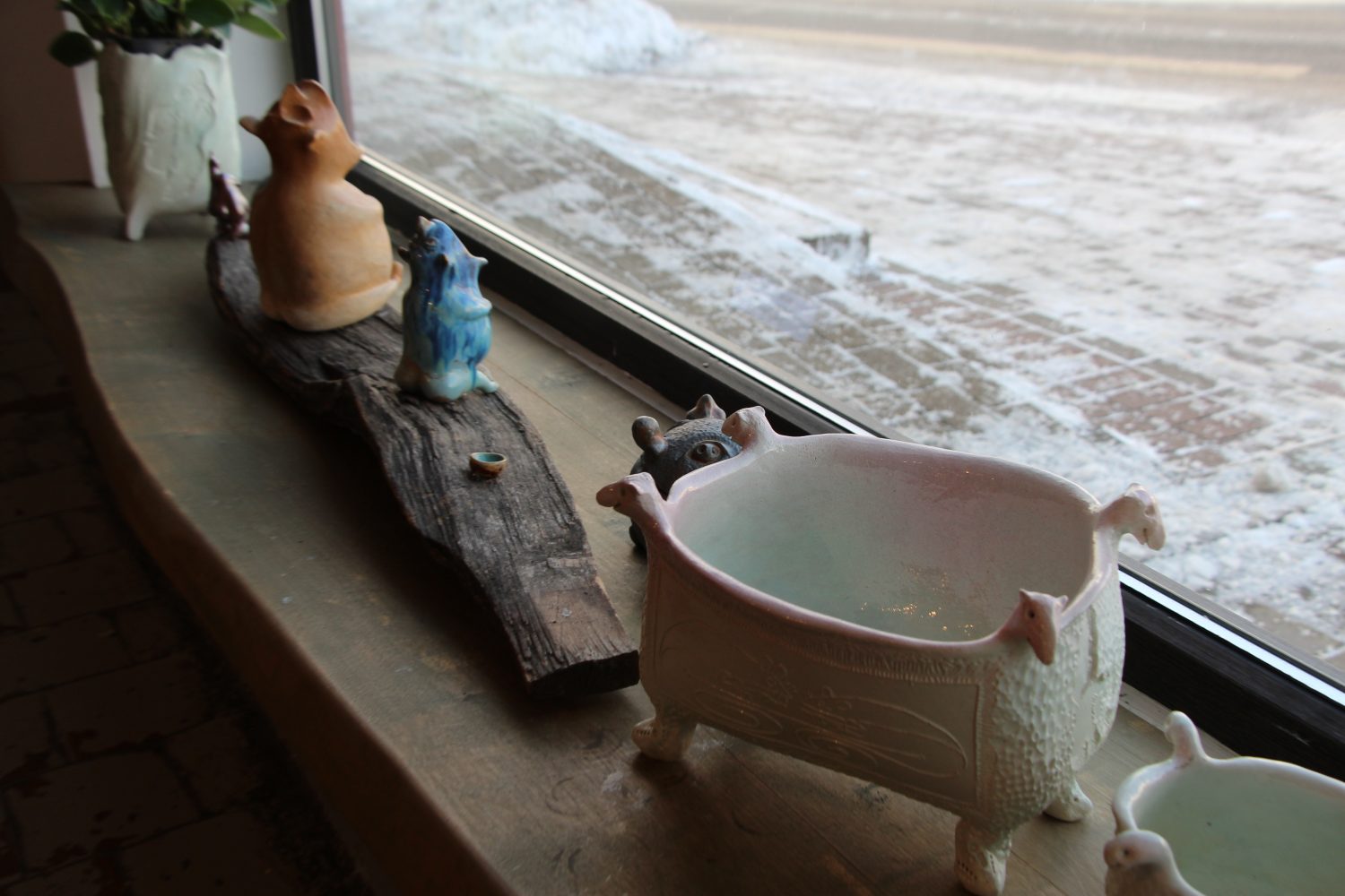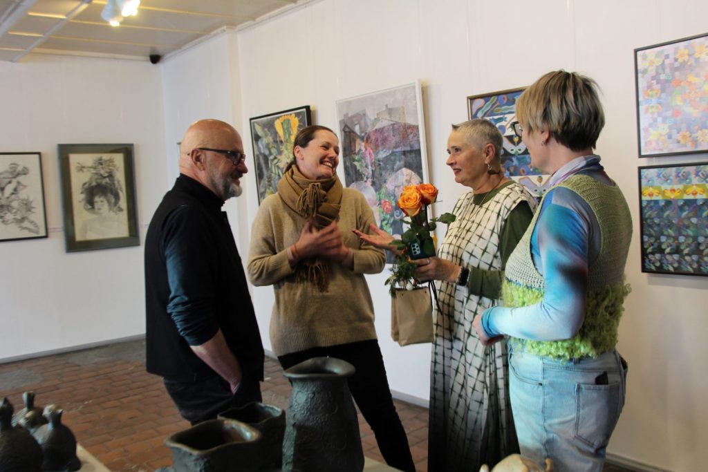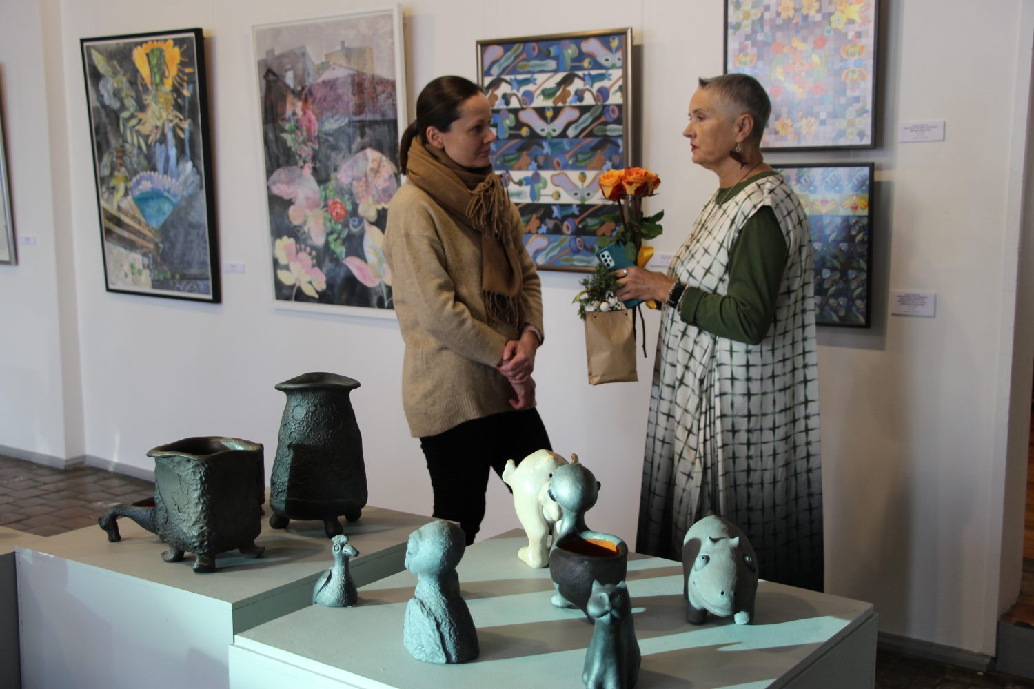 “Mēs esam Biruta un Jānis Roberts Jansoni. Nākam no Rīgas. Esam dzīvojuši Valmierā, Mazsalacā, Rīgā, bet tagad esam Slampē,” tā stāstu par sevi un savu izstādi galerijā «Durvis» sāk mākslinieki. Kamēr mēs ar Birutu runājamies, Jānis Roberts kopā ar meitu Tiju izdara pēdējos izstādes labojumus. Tija Vīksna, arī māksliniece un pedagoģe, palīdz mākslas darbus salikt tā, lai katrā ieraugāms tā īpašais vēstījums: “Palūkojiet, kā tēva radītās keramikas glazūras krāsas sasaucas ar mammas akvareļiem, vai viņas melnbaltie zīmējumi un eņģelīši… Nejauši tā ir salicies…”