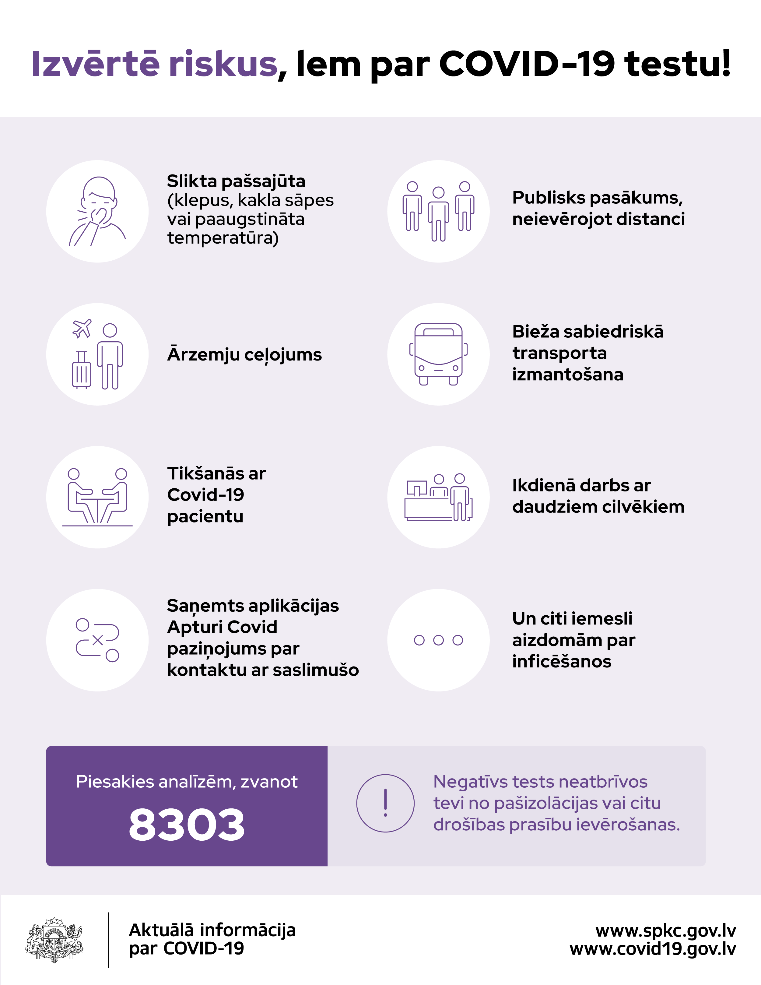 Mazinoties noteiktajiem ierobežojumiem un pieaugot personu skaitam, kas dodas ārpus Latvijas, Veselības ministrija lēmusi, ka arī turpmāk ikviens, kuram būs aizdomas par inficēšanos, varēs veikt valsts apmaksātu Covid-19 testu. Pieteikties testam var zvanot pa tālruni 8303. Lai saprastu, vai tests būtu jāveic, Veselības ministrija aicina izvērtēt, kādi ir bijuši iespējamie riski inficēties: