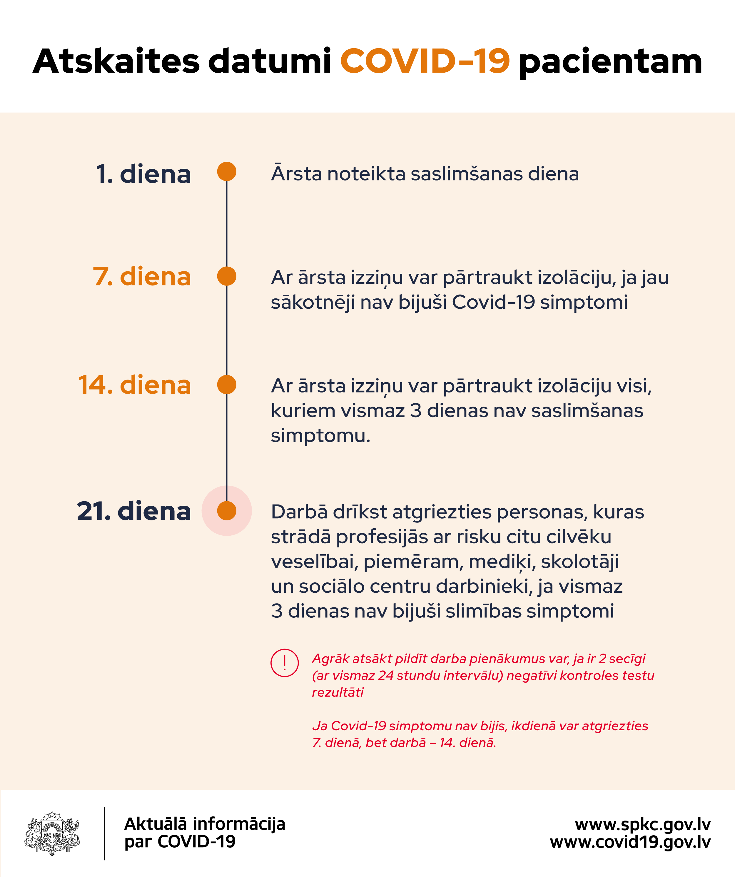 Sabalansējot Covid-19 izplatības riskus sabiedrībā un Covid-19 pacientu izolācijas radītās sekas uz tautsaimniecību un sabiedrību kopumā, kā arī slogu veselības sektoram, Veselības ministrija ir pārskatījusi arī kārtību, pēc kuras ārsts pieņem lēmumu par Covid-19 pacienta izolācijas pārtraukšanu. Pamatojoties uz šobrīd pieejamo informāciju par Covid-19 norises gaitu un citu valstu pieredzi, turpmāk, ja personai jau sākotnēji nebūs bijuši Covid-19 simptomi, izolāciju ar ārsta lēmumu varēs pārtraukt 7., nevis 14. dienā pēc Covid-19 laboratoriskās apstiprināšanas. Savukārt, ja personai būs slimības pazīmes, par izolācijas pārtraukšanu varēs lemt sākot no 14. dienas, ja pēc simptomu izzušanas būs pagājušas vismaz 3 dienas.  Šajos gadījumos gala lēmumu pieņem ārsts un pacientam tiks izsniegts apliecinājums, ka stingro izolāciju var pārtraukt.