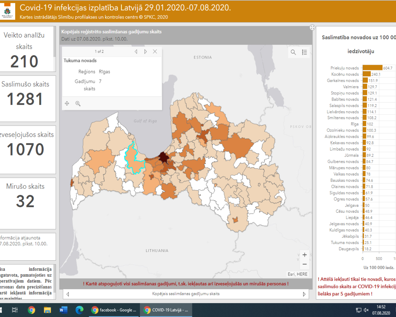 Jāpiebilst, ka 7. augusta infografiks liecina, ka Tukuma novadā šobrīd ir 7 saslimušie, Engures novadā to ir mazāk, nekā pieci, savukārt Kandavas novadā Covid-19 līdz šim nav konstatēts.
