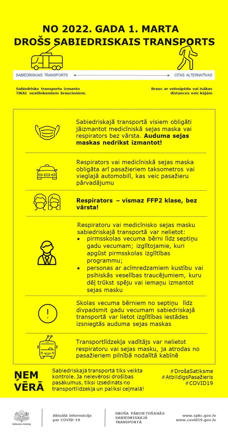 Vienlaikus sabiedriskajā transportā, taksometros un pasažieru komercpārvadājumos ar vieglo automobili aizvien spēkā paliek līdz šim noteiktā prasība obligāti izmantot FFP2 klases respiratoru bez vārsta (respiratori) vai medicīniskās sejas masku.