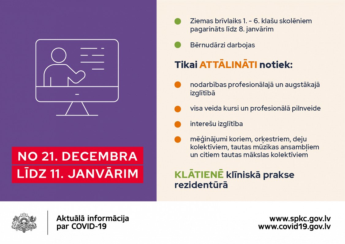 *Klātienē (arī ne individuāli) nenotiks nekāda veida praktiskās nodarbības. Arī profesionālajā un augstākajā izglītībā, dažādos kursos utml. nodarbības drīkstēs notikt tikai attālināti. Izņēmums ir klīniskā prakse rezidentūrā.