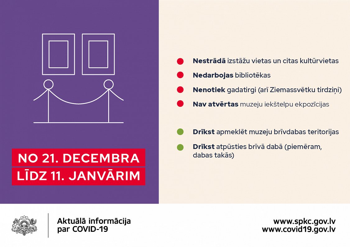 *Nestrādās bibliotēkas, izstāžu vietas un citas kultūrvietas, kā arī nedrīkstēs organizēt gadatirgus (arī Ziemassvētku tirdziņus).