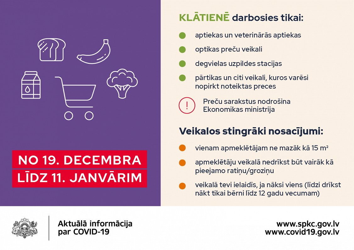 Laikā no 19. decembra līdz 11. janvārim katru dienu būs piemērots regulējums, kas līdz šim attiecās uz brīvdienām un svētku dienām, bet būs paplašinātas preču grupas, ko šajā laikā drīkst tirgot. Tas nozīmē, ka šajās 3 nedēļās klātienē darbosies tikai:
