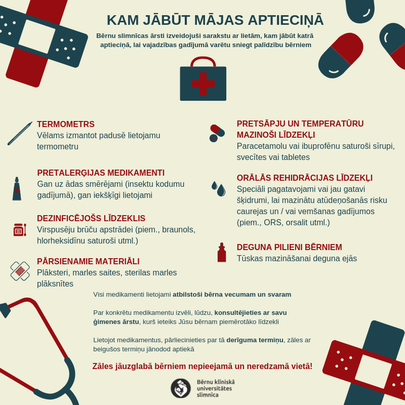 “Vasarā ierasti atgādinām par traumatisma pieaugumu, kura dēļ daudzi bērni nonāk Bērnu slimnīcas Neatliekamās medicīniskās palīdzības nodaļā. Taču šogad novērojam, ka vecāki ar bērniem bieži ierodas Neatliekamās medicīniskās palīdzības nodaļā dažādu vīrusu izraisītu saslimšanu dēļ. Bērniem, kuru veselības stāvoklis ir kritisks, mūsu ārsti sniedz tūlītēju palīdzību, taču lielās pacientu plūsmas dēļ daudziem pacientiem līdz konsultācijai ar ārstu var nākties gaidīt pat vairākas stundas. Prognozējam, ka līdzīga situācija būs arī svētku un pēcsvētku dienās. Tāpēc rosinām pārbaudīt, vai ģimenes aptieciņā ir viss nepieciešamais, lai vecāki varētu parūpēties par bērna veselības stāvokli un uzlabot viņa pašsajūtu mājās. Tas var novērst nepieciešamību doties pie dežūrārsta vai uz slimnīcu un veikt dažādas medicīniskas manipulācijas, piemēram, katetra ievietošanu šķidruma un medikamentu ievadīšanai,” stāsta Bērnu slimnīcas virsārste Renāte Snipe.