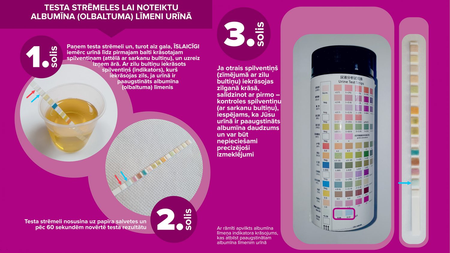 “Pacienta informētībai ir liela nozīme, jo diezgan ilgi hroniska nieru slimība norit bez pašsajūtas traucējumiem, pacientam var nebūt sūdzību. Aicinu izņemt bezmaksas testu un mājās pārbaudīt vai tests uzrāda urīnā mazās olbaltumvielas. Ja pārbaudi mājās ar testa strēmeli veicāt atbilstoši pievienotajai instrukcijai un ieguvāt rezultātu, kas liecina par iespējami paaugstināta albumīna jeb olbaltumvielu līmeni urīnā, tad aicinu vērsties pie sava ģimenes ārsta pēc nosūtījuma urīna analīzei, urīna mikroskopijai, un albumīna/kreatinīna attiecības noteikšanai urīnā sertificētā laboratorijā. Gadījumā, ja arī laboratorijas analīžu rezultāti liecina par paaugstinātu albumīna (olbaltumviela) līmeni urīnā, kas liek domāt par iespējamu nieru slimību, aicinu vērsties pie nefrologa!” norāda asoc.prof. Ieva Ziediņa.
